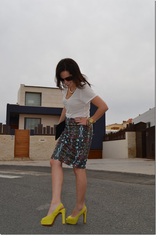 Hoy un look con una falda “fantasma” y es que igual que apareció en las tiendas volvió a desaparecer y nunca más la vi. Menos mal que no me lo pensé mucho a la hora de decidirme porque me hubiese quedado sin ella. Como tiene tanto colorido la combiné con camiseta blanca y zapatos en amarillo, otra gran compra de esta temporada.